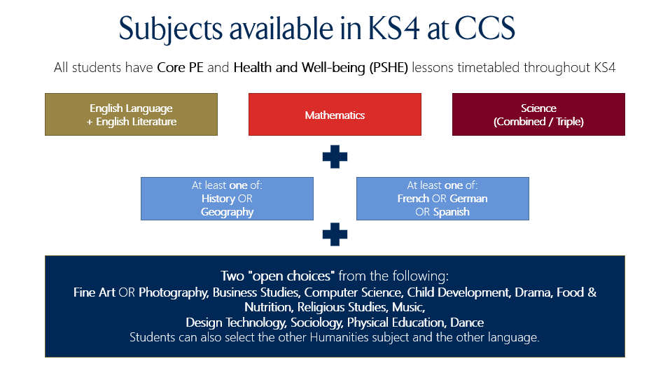 A reminder that as well as all compulsory subjects for students (English, maths and science), they must choose a humanities subject of either history or geography, and one language (French, German or Spanish).